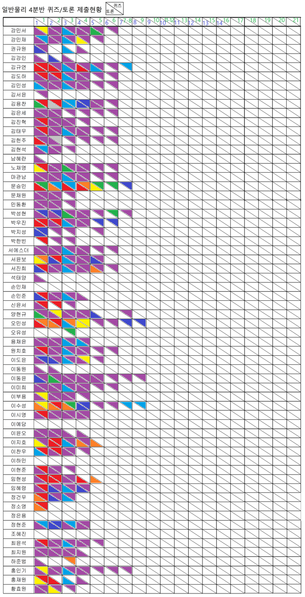 ¼ö¾÷ÀÏÀÚ ´çÀÏ Á¦Ãâ »¡°£»ö, ´ÙÀ½ ³¯ Á¦Ãâ ÁÖȲ»ö, ±× ´ÙÀ½³¯ ³ë¶õ»ö, ±× ´ÙÀ½³¯ ÃÊ·Ï»ö...ÆÄ¶õ»ö, .....´ÙÀ½ ÁÖ ¼ö¾÷ Àü³¯ Á¦Ãâ º¸¶ó»öÀ¸·Î ¹«Áö°³»ö ¼øÀÔ´Ï´Ù.