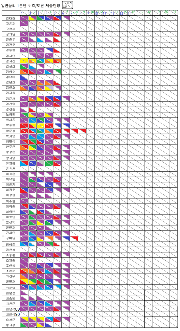 Åä·Ð/ÄûÁî Á¦ÃâÇöȲÀÔ´Ï´Ù. ¼ö¾÷ÀÏÀÚ ´çÀÏ Á¦Ãâ »¡°£»ö, ´ÙÀ½ ³¯ Á¦Ãâ ÁÖȲ»ö, ±× ´ÙÀ½³¯ ³ë¶õ»ö, ±× ´ÙÀ½³¯ ÃÊ·Ï»ö...ÆÄ¶õ»ö, .....´ÙÀ½ ÁÖ ¼ö¾÷ Àü³¯ Á¦Ãâ º¸¶ó»öÀ¸·Î ¹«Áö°³»ö ¼øÀÔ´Ï´Ù. ºü¸¥ Á¦ÃâÀ» µ¶·ÁÇÏ´Â ´À³¦À¸·Î »ö±ò·Î Ç¥½ÃÇϰí ÀÖ½À´Ï´Ù. ±×·³ ¿°øÇϼ¼¿ä~