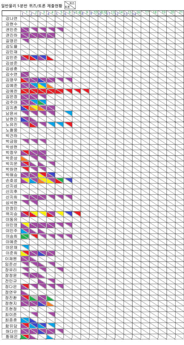 Åä·Ð/ÄûÁî Á¦ÃâÇöȲÀÔ´Ï´Ù. ¼ö¾÷ÀÏÀÚ ´çÀÏ Á¦Ãâ »¡°£»ö, ´ÙÀ½ ³¯ Á¦Ãâ ÁÖȲ»ö, ±× ´ÙÀ½³¯ ³ë¶õ»ö, ±× ´ÙÀ½³¯ ÃÊ·Ï»ö...ÆÄ¶õ»ö, .....´ÙÀ½ ÁÖ ¼ö¾÷ Àü³¯ Á¦Ãâ º¸¶ó»öÀ¸·Î ¹«Áö°³»ö ¼øÀÔ´Ï´Ù. ºü¸¥ Á¦ÃâÀ» µ¶·ÁÇÏ´Â ´À³¦À¸·Î »ö±ò·Î Ç¥½ÃÇϰí ÀÖ½À´Ï´Ù. ±×·³ ¿°øÇϼ¼¿ä~
